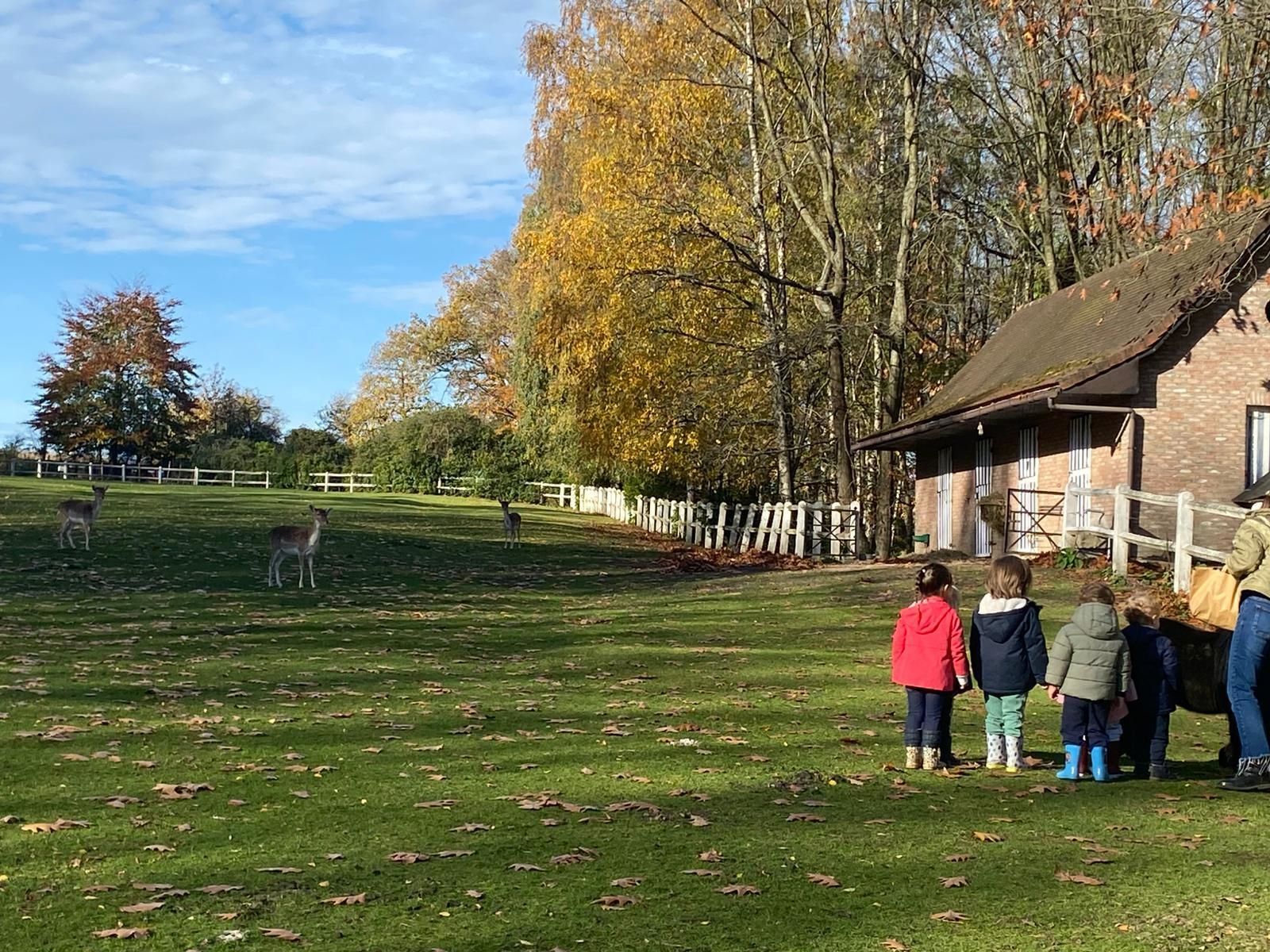 Dès leur arrivée, les petits explorateurs se sont lancés dans une chasse aux feuilles dorées, aux glands et aux châtaignes, remplissant leurs paniers de souvenirs. Mais la plus belle surprise les attendait un peu plus loin : une rencontre avec des daims apprivoisés. Timides au début, ces élégants animaux se sont rapidement approchés, attirés par les morceaux de pain sec que les enfants leur offraient avec enthousiasme. Les rires et les oh ! d’émerveillement ont résonné dans le jardin, créant une ambiance chaleureuse et complicité entre les enfants et la nature.