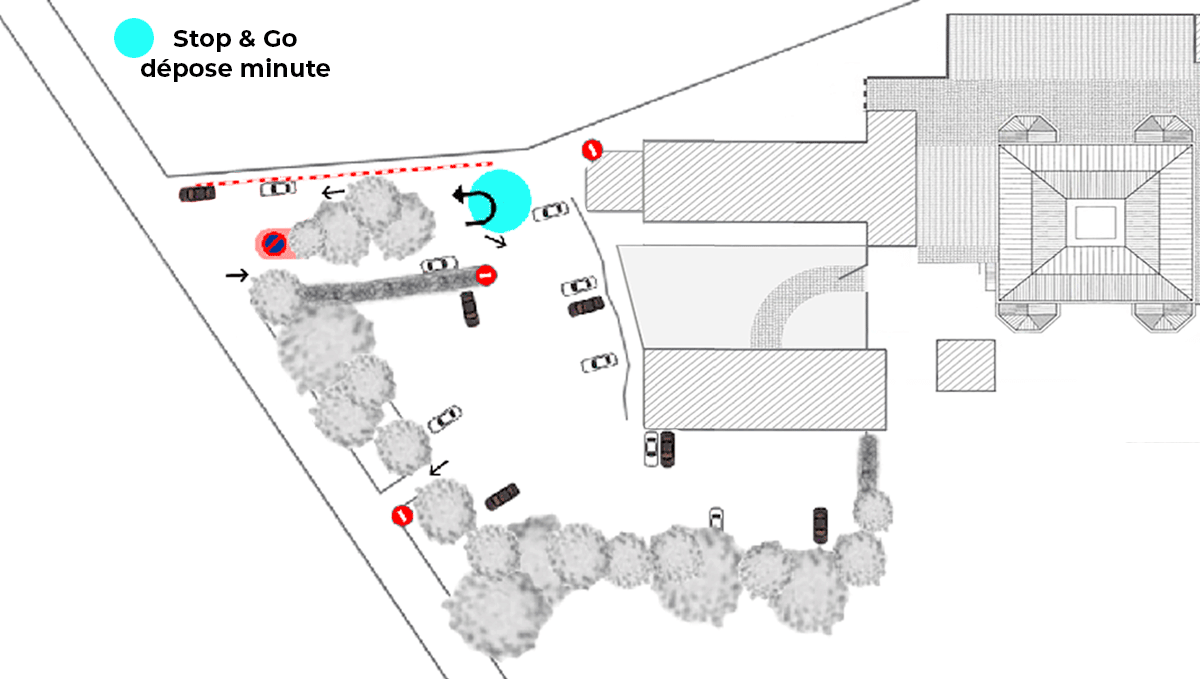 Le dépose-minute ou "Stop & Go", comme son nom l’indique, permet aux parents de déposer rapidement leurs enfants devant l’école. C’est une voie de circulation qui ne doit en aucun cas être obstruée, ni le matin ni le soir, sous peine de créer un bouchon dans la montée, et jusque sur la route.